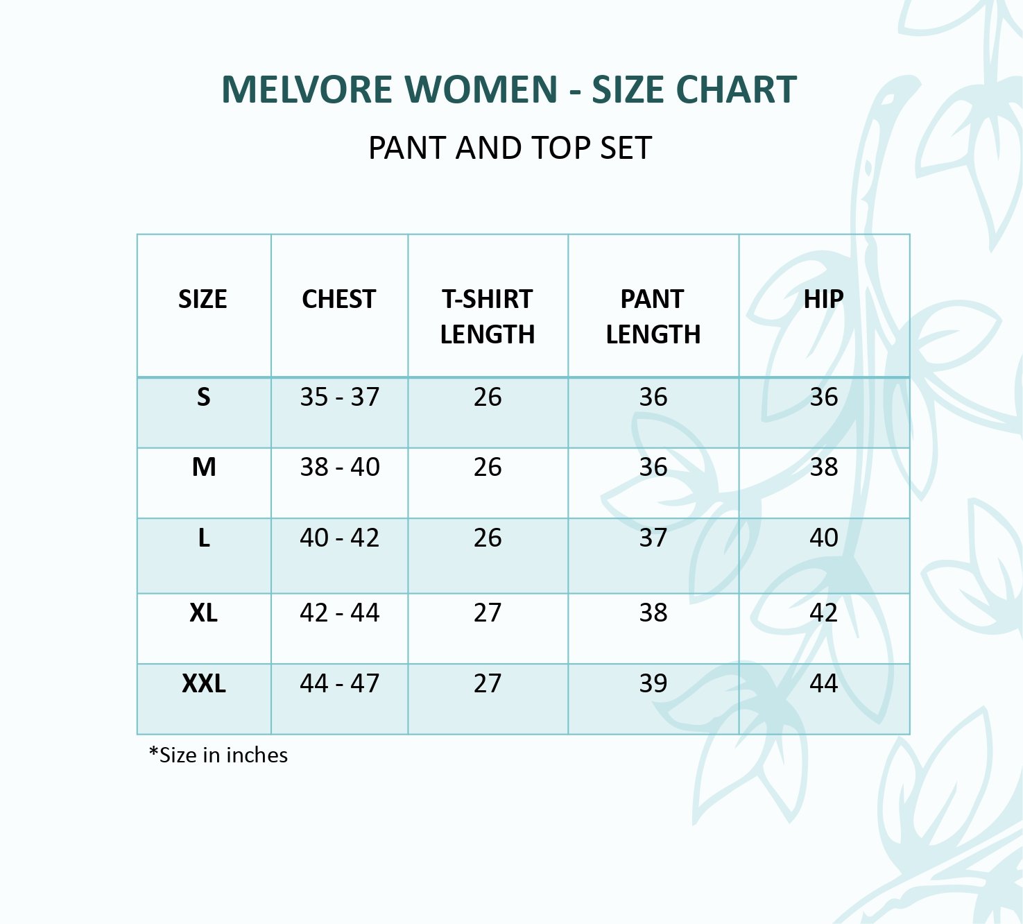 Size Chest T-Shirt Length Pant Length Hip S 35 – 37 26 36 36 M 38 – 40 26 36 38 L 40 – 42 26 37 40 XL 42 – 44 27 38 42 XXL 44 – 47 27 39 44 *Size in inches